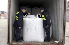 近日,上海海關(guān)兩名現(xiàn)場作業(yè)人員打開一個(gè)封存的集裝箱,一股刺鼻的嗆人氣味撲面涌出,箱子里塞滿了編織袋包裝物...