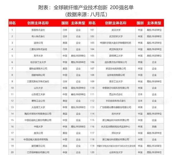 ????????據報告評測結果,全球碳纖維產業技術創新200強中,麗株式會社居于首位,第2名為帝人株式會社,第3名為波音公司,第4至10名依次為三菱化學株式會社、東華大學、哈爾濱工業大學、福特全球技術公司、國家電網公司、三菱瓦斯化學株式會社和山東大學。