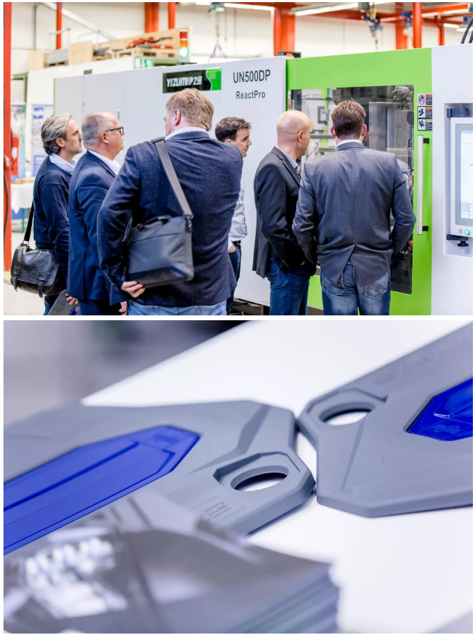 ????????伊之密與合作伙伴Frimo提供的ReactPro方案,將注射成型與聚氨酯(PUR)包覆工藝結合在一起,更簡單、更模塊化、更靈活、更具成本效益。在Frimo總部舉行的聯合技術開放日上,第一套高度集成和自動化的ReactPro系統亮相,現場生產帶聚氨酯表面的發動機蓋,吸引了不少感興趣的專業觀眾。