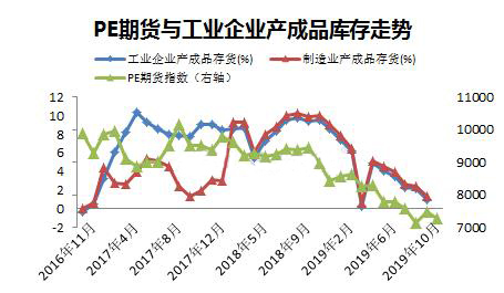 ????????從PE期貨價格指數跟工業企業產成品存貨走勢上看,PE期貨指數2017年6月份形成高點,2018年年內高點在2018年7月,PE價格還是領先庫存,庫存周期的開啟是匯總大宗商品的周期,PE產品在周期中也難以獨善其身,最終是跟隨大宗商品量價齊跌。