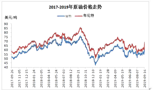 ????????9月14日,沙特關(guān)鍵原油設施遭受無人機攻擊,導致其關(guān)閉一半原油產(chǎn)量,影響全球約5%的日均產(chǎn)量。9月16日,原油受此提振大幅上漲,美布兩油均創(chuàng)下近十年內(nèi)最大漲幅,紐約商品期貨交易所WTI 10月原油期貨合約收盤上漲8.05美元,至62.90美元/桶,漲幅14.68%,洲際交易所布倫特11月原油期貨合約收盤上漲8.80美元,至69.02美元/桶,漲幅14.61%。