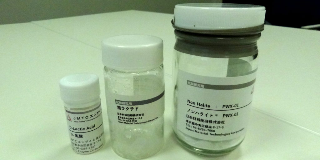 ????????然后,關于用于醫療應用的生物可吸收材料和可生物降解樹脂,JMTC已經建立了具有高光學純度的D-乳酸的工業生產技術。D-乳酸是聚(乳酸-共-羥基乙酸)(PLGA)和聚乳酸(PLA)等的原料。基于AGC公司開發的基因改造技術(TYO:5201),JMTC已經建立了一種從植物中獲得這種D-乳酸的小批量生產方法。