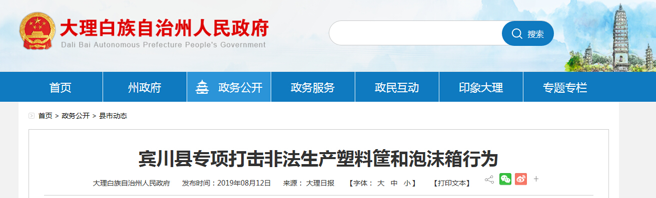 ????????據大理白族自治州人民政府8月12日消息,賓川縣成立了聯合檢查整治組,從8月5日開始,在全縣范圍內開展為期40多天的打擊非法生產制造塑料筐,和泡沫箱集中專項整治行動。
