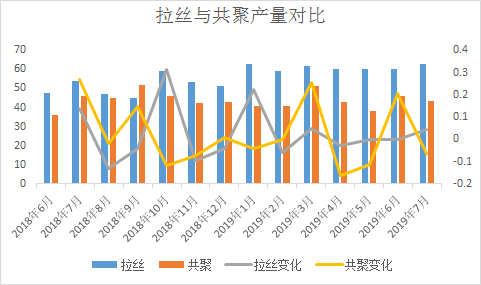 ????????拉絲價格走高除受期貨拉漲以外,粉料價格高位仍在支撐粒料價格高位不下的原因,裝置排產(chǎn)來看,部分停車裝置再現(xiàn)利好,新投產(chǎn)裝置量產(chǎn)偏少,拉絲體量較大,且多為快消品,剛需存在。