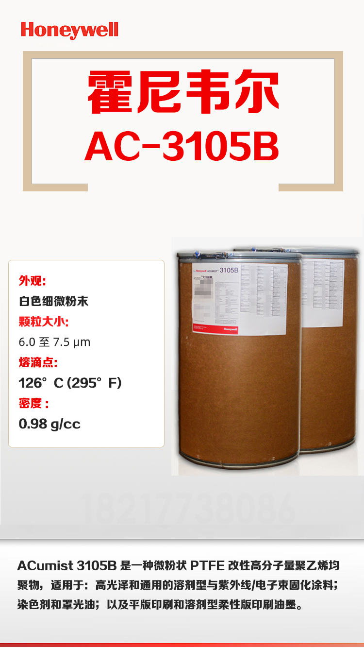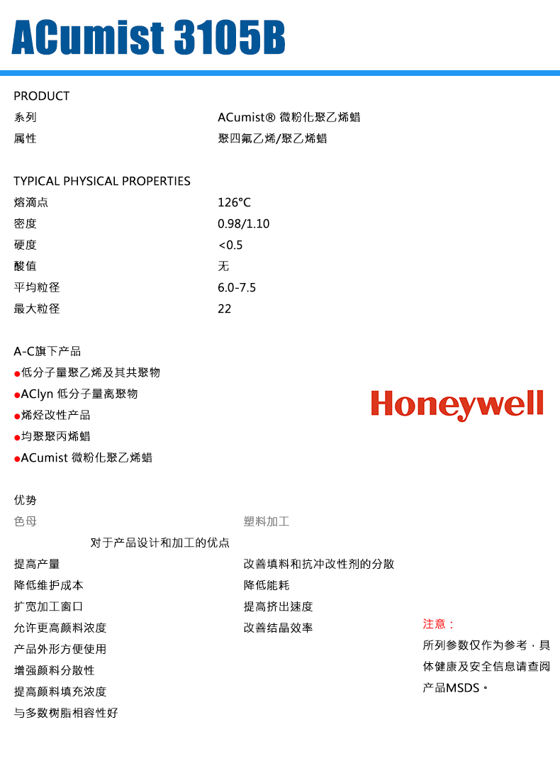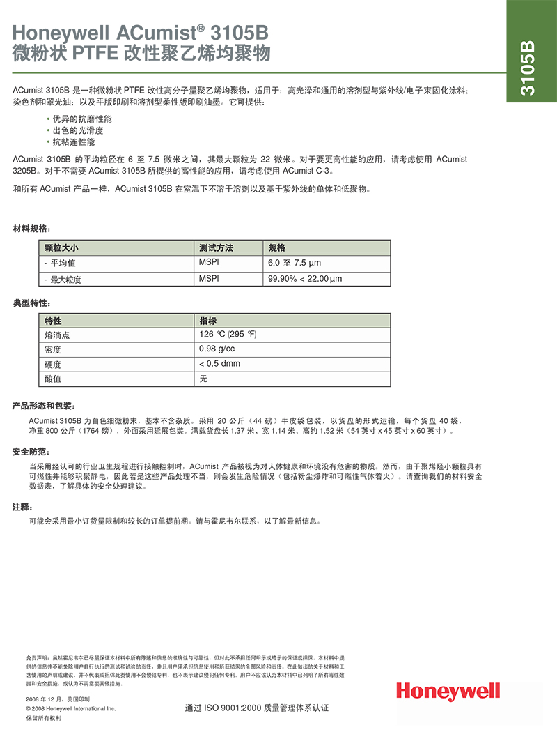 • 美國霍尼韋爾ACumist 3105B 聚四氟乙烯聚乙烯混合蠟粉 物性表, 美國霍尼韋爾ACumist 3105B 聚四氟乙烯聚乙烯混合蠟粉 產品參數,美國霍尼韋爾ACumist 3105B 聚四氟乙烯聚乙烯混合蠟粉 性能表,美國霍尼韋爾ACumist 3105B 聚四氟乙烯聚乙烯混合蠟粉 出廠報告, MSDS,, 物質安全資料表, UL黃卡,{ SGS報告, RoHS, 食品級認證, NSF飲用水標準, 產品資料, 產品性能, 出廠報告, 原廠原包, 代理商, 熱變形溫度, 熔指數, 流動系數, 抗沖擊性能、沖擊強度, 低溫韌性、低溫抗沖擊性能, 熔體流動系數、熔體流動速率, 加工工藝、加工參數、加工溫度, 歐盟RoHS 德國FDA 美國FDA 日本FDA