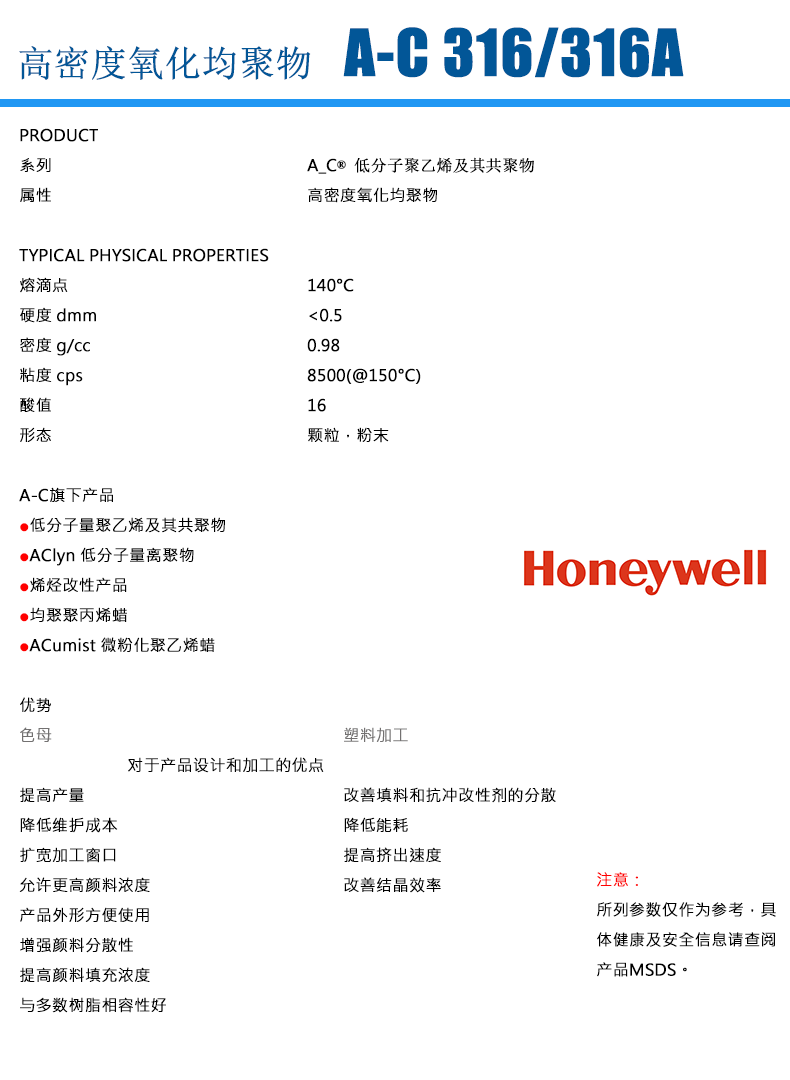 • 霍尼韋爾 Honeywell AC 316A 氧化高密度聚乙烯蠟 物性表, 霍尼韋爾 Honeywell AC 316A 氧化高密度聚乙烯蠟 產品參數,霍尼韋爾 Honeywell AC 316A 氧化高密度聚乙烯蠟 性能表,霍尼韋爾 Honeywell AC 316A 氧化高密度聚乙烯蠟 出廠報告, MSDS,, 物質安全資料表, UL黃卡,{ SGS報告, RoHS, 食品級認證, NSF飲用水標準, 產品資料, 產品性能, 出廠報告, 原廠原包, 代理商, 熱變形溫度, 熔指數, 流動系數, 抗沖擊性能、沖擊強度, 低溫韌性、低溫抗沖擊性能, 熔體流動系數、熔體流動速率, 加工工藝、加工參數、加工溫度, 歐盟RoHS 德國FDA 美國FDA 日本FDA