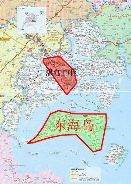東海島位于在中國雷州半島東部,歷史上屬雷州府遂溪縣轄島。1958年東北大堤修建后方便了島民出入,今屬湛江市經濟開發區,島內主要通有東山、東簡、民安3個街道辦。地勢東高西低,東為玄武巖臺地,西為海積平原。東端距海灘2公里,有海拔111米高的龍水嶺火山錐,面積500×500米,為火山碎屑巖及少量玄武巖構成,是天然航海陸標。蔚鶨港和北山港為島內最大漁港。蔚鶨附近6.5公里岸線,水深26~40米,其中40米深水航道650米。島內有尚待開發的土地40余萬畝,地勢平坦,標高4~14米,為地質堅硬的火成巖基地。地下水日開采量可達50萬立方米。盛產魚、鹽,有庵里、紅旗鹽場,海水養殖 以鮑魚和對蝦著稱。海灘綿長且潔白。
