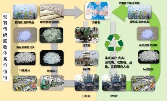 在舊的PET價值鏈中,PET回收、分選和打包站,都是靠拾荒人群,沒有環(huán)保成本和對工人的保護,物流效率低下,瓶片賣到化纖企業(yè),再生產(chǎn)品沒有很高附加值。而現(xiàn)在這種模式已經(jīng)難以為繼,品牌企業(yè)的加入,對于高品質可追溯PET瓶的要求,城市垃圾分類,環(huán)保執(zhí)法,致使拾荒人群逐步消失,取而代之的是高品質回收體系,回收+互聯(lián)模式的構建,同時這也增加了回收系統(tǒng)的成本。用再靠賣給化纖工廠這些方式已經(jīng)不能的低端低值應用,無法維持PET的價值鏈。