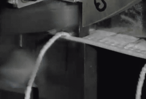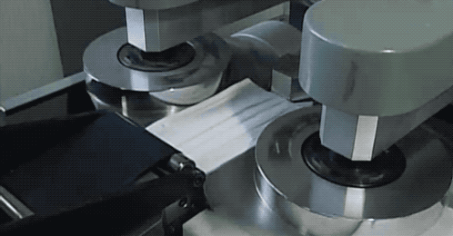 左右兩大卷無(wú)紡布,等著要補(bǔ)強(qiáng)口罩邊沿了。 一側(cè)被包裹之后,立刻壓平粘合。 這時(shí)候出來(lái)的原先已經(jīng)裁斷好的口罩們,再次被連到了一起,這真的是自古多情空余恨,此恨綿綿無(wú)絕期... 所以還需要一個(gè)裁斷補(bǔ)強(qiáng)邊的環(huán)節(jié),一刀兩斷...