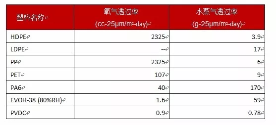 ????????塑料的阻隔性是指塑料包裝材料或容器防止小分子氣體,如氧氣、二氧化碳、氮氣、水蒸氣、香味及其他有機溶劑蒸汽等透過的能力。用于表征塑料阻隔能力大小的指標為透過率,即一定厚度的塑料制品在一定壓力、溫度和濕度條件下,單位時間和單位面積內(nèi)透過小分子物質(zhì)的體積或重量。塑料的透過率越小,說明其阻隔能力越高。下表給出了一些常用塑料的透氣、透濕率: