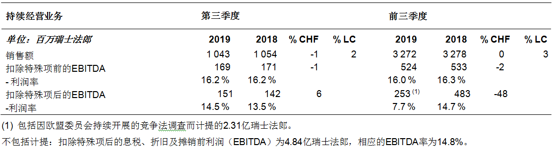 ????????· 持續經營業務扣除特殊項(不包括歐盟委員會計提)后息稅、折舊及攤銷前利潤(EBITDA)穩定在4.84億瑞士法郎