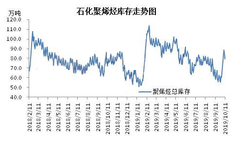 ????????為準(zhǔn)備國慶長假,節(jié)前下游一度出現(xiàn)補(bǔ)倉,帶動9月底庫存降至最低時(shí)為55.5萬噸,雖最后庫存稍有增加,但整體情況尚可。隨著國慶長假到來,市場基本處于休市狀態(tài),導(dǎo)致假期石化庫存大幅積累,增加28萬噸。即便節(jié)后下游補(bǔ)貨,但高庫存導(dǎo)致心態(tài)謹(jǐn)慎,多為剛需采購,庫存消耗緩慢并不理想。截止10月11日,石化兩桶油庫存為79.5萬噸。