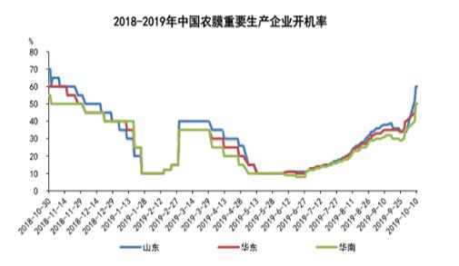 ????????隨著“金九銀十”農(nóng)膜旺季逐漸到來,受節(jié)后需求增加的影響,終端用戶旺季買入意向增強(qiáng),訂單有所增加,加之不受節(jié)日環(huán)保政策制約的影響后,部分小廠家重新啟動,因此全國農(nóng)膜開工率出現(xiàn)明顯提升。目前全國農(nóng)膜整體開機(jī)率在50%左右,山東地區(qū)農(nóng)膜開工率提升至60%,一定程度上帶動了整體需求。