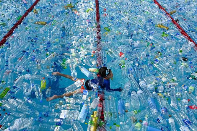 當地時間2019年6月8日,泰國曼谷,民眾在裝滿塑料瓶的游泳池里游泳,以紀念世界海洋日,警醒塑料污染。 (視覺中國/圖)