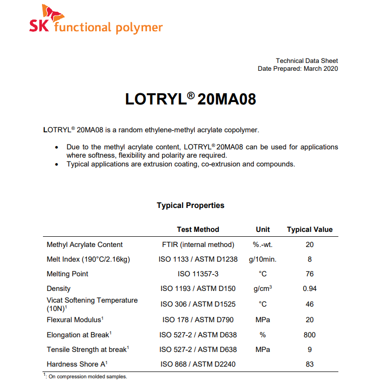 • 阿科瑪增韌劑相容劑EMA Lotryl 20MA08 物性表, 阿科瑪增韌劑相容劑EMA Lotryl 20MA08 產品參數,阿科瑪增韌劑相容劑EMA Lotryl 20MA08 性能表,阿科瑪增韌劑相容劑EMA Lotryl 20MA08 出廠報告, MSDS,, 物質安全資料表, UL黃卡,{ SGS報告, RoHS, 食品級認證, NSF飲用水標準, 產品資料, 產品性能, 出廠報告, 原廠原包, 代理商, 熱變形溫度, 熔指數, 流動系數, 抗沖擊性能、沖擊強度, 低溫韌性、低溫抗沖擊性能, 熔體流動系數、熔體流動速率, 加工工藝、加工參數、加工溫度, 歐盟RoHS 德國FDA 美國FDA 日本FDA