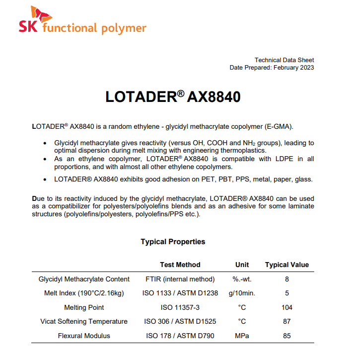• EMA 法國阿科瑪Lotader AX 8840 粘接性好 無規共聚物 可分散 塑料改性 粘合劑 物性表, EMA 法國阿科瑪Lotader AX 8840 粘接性好 無規共聚物 可分散 塑料改性 粘合劑 產品參數,EMA 法國阿科瑪Lotader AX 8840 粘接性好 無規共聚物 可分散 塑料改性 粘合劑 性能表,EMA 法國阿科瑪Lotader AX 8840 粘接性好 無規共聚物 可分散 塑料改性 粘合劑 出廠報告, MSDS,, 物質安全資料表, UL黃卡,{ SGS報告, RoHS, 食品級認證, NSF飲用水標準, 產品資料, 產品性能, 出廠報告, 原廠原包, 代理商, 熱變形溫度, 熔指數, 流動系數, 抗沖擊性能、沖擊強度, 低溫韌性、低溫抗沖擊性能, 熔體流動系數、熔體流動速率, 加工工藝、加工參數、加工溫度, 歐盟RoHS 德國FDA 美國FDA 日本FDA