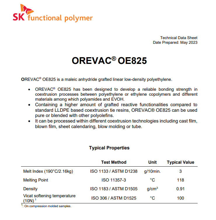 • 法國阿科瑪 PEPA三層共擠 Orevac OE825 馬來酸酐改性粘合劑樹脂 物性表, 法國阿科瑪 PEPA三層共擠 Orevac OE825 馬來酸酐改性粘合劑樹脂 產品參數,法國阿科瑪 PEPA三層共擠 Orevac OE825 馬來酸酐改性粘合劑樹脂 性能表,法國阿科瑪 PEPA三層共擠 Orevac OE825 馬來酸酐改性粘合劑樹脂 出廠報告, MSDS,, 物質安全資料表, UL黃卡,{ SGS報告, RoHS, 食品級認證, NSF飲用水標準, 產品資料, 產品性能, 出廠報告, 原廠原包, 代理商, 熱變形溫度, 熔指數, 流動系數, 抗沖擊性能、沖擊強度, 低溫韌性、低溫抗沖擊性能, 熔體流動系數、熔體流動速率, 加工工藝、加工參數、加工溫度, 歐盟RoHS 德國FDA 美國FDA 日本FDA