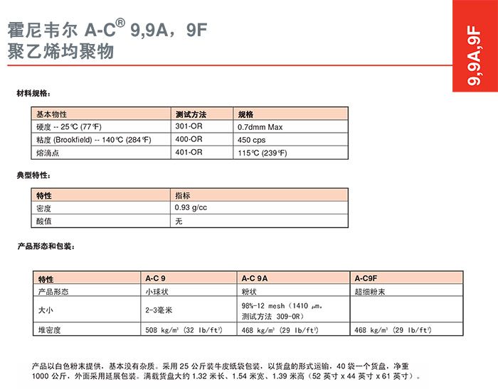 - 霍尼韋爾 AC® 9 低密度聚乙烯 (LDPE) 均聚物 物性表, 霍尼韋爾 AC® 9 低密度聚乙烯 (LDPE) 均聚物 產(chǎn)品參數(shù),霍尼韋爾 AC® 9 低密度聚乙烯 (LDPE) 均聚物 性能表,霍尼韋爾 AC® 9 低密度聚乙烯 (LDPE) 均聚物 出廠報(bào)告, MSDS,, 物質(zhì)安全資料表, UL黃卡,{ SGS報(bào)告, RoHS, 食品級(jí)認(rèn)證, NSF飲用水標(biāo)準(zhǔn), 產(chǎn)品資料, 產(chǎn)品性能, 出廠報(bào)告, 原廠原包, 代理商, 熱變形溫度, 熔指數(shù), 流動(dòng)系數(shù), 抗沖擊性能、沖擊強(qiáng)度, 低溫韌性、低溫抗沖擊性能, 熔體流動(dòng)系數(shù)、熔體流動(dòng)速率, 加工工藝、加工參數(shù)、加工溫度, 歐盟RoHS 德國(guó)FDA 美國(guó)FDA 日本FDA