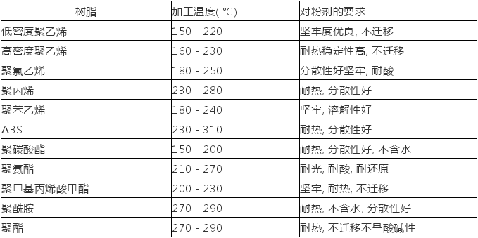 ????????樹脂加工溫度及對著色劑的要求: