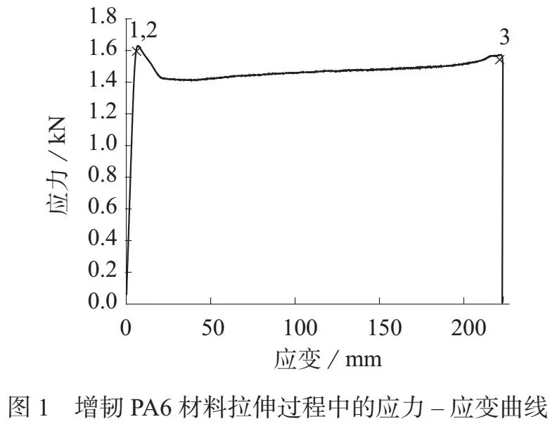 ????????拉伸強(qiáng)度在材料拉伸曲線中的位置如圖1 中的1 點所示。從表1 可以看到,一次擠出過程得到的增韌PA6 材料的拉伸強(qiáng)度為48.18 MPa,但是經(jīng)過二次擠出過程后,增韌PA6 材料的拉伸強(qiáng)度下降為41.47 MPa。