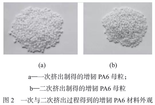 ????????在二次擠出過程中雖然加入了與一次過程等量的抗氧劑,但是增韌PA6 材料仍然發(fā)生了明顯的氧化現(xiàn)象,一次與二次擠出過程得到的增韌PA6 材料外觀如圖2 所示。從圖2 可以看到,二次擠出過程得到的增韌PA6 顆粒顏色明顯比一次擠出過程顆粒顏色深,說明二次擠出過程增韌PA6 材料發(fā)生了更多的氧化降解,因此二次擠出過程中得到的增韌PA6材料的拉伸強(qiáng)度更低。