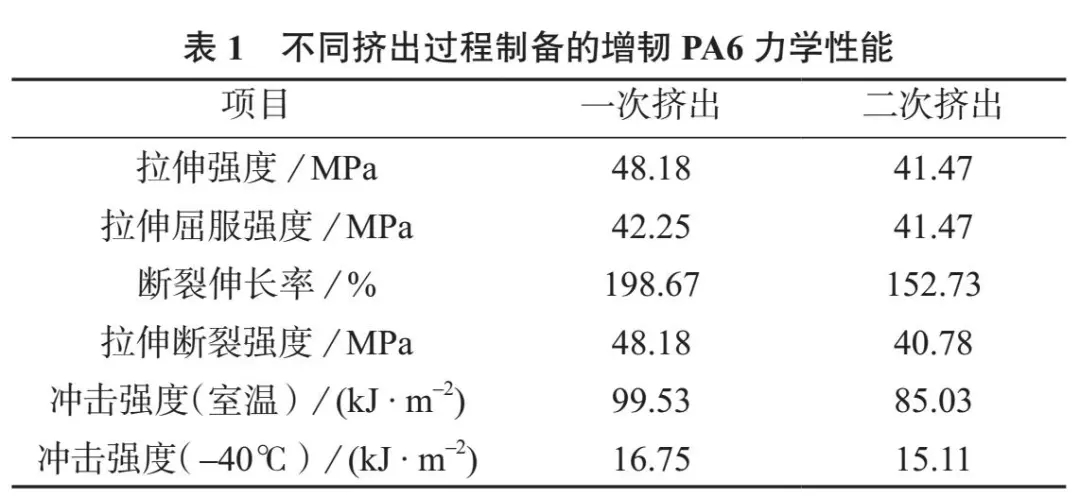????????以PA6、聚烯烴增韌劑、抗氧劑為原料,研究一次擠出和二次擠出制備的增韌PA6 材料的拉伸強(qiáng)度、拉伸屈服強(qiáng)度、斷裂伸長率、拉伸斷裂強(qiáng)度、室溫和–40℃沖擊強(qiáng)度?。